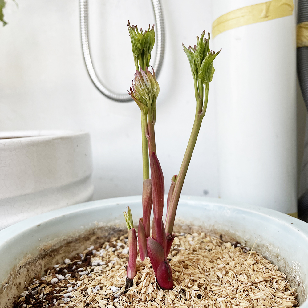 보온되라고 왕겨를 덮어주었고, 남향의 베란다에 매일 LED 등까지 켜줬더니 촉이 쓱쓱 자라납니다. 거의 매일 자라는게 보일 정도에요